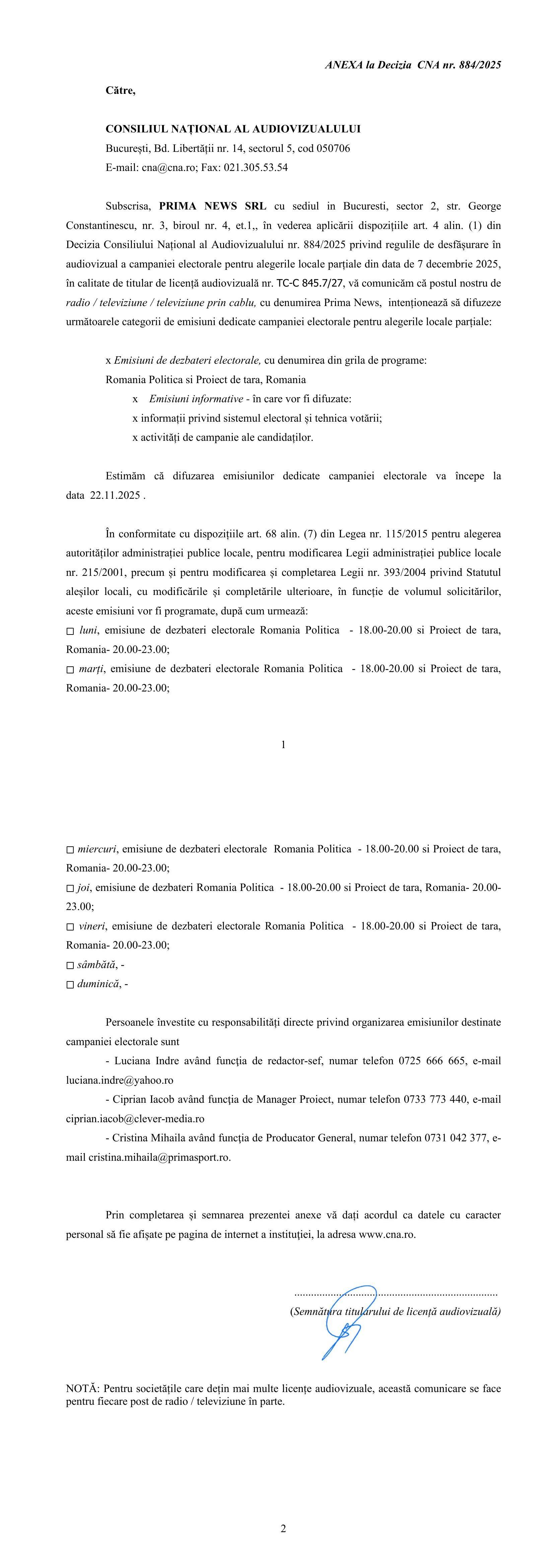 Prima News va difuza, începând cu 22 noiembrie 2025, emisiuni speciale dedicate campaniei electorale pentru alegerile locale parţiale. Postul va include în program atât dezbateri electorale, cât şi emisiuni informative despre sistemul de vot şi activităţile candidaţilor.