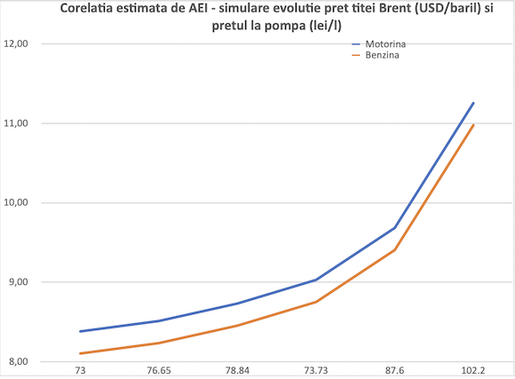 Potrivit calculelor AEI, o majorare a preţului petrolului cu 10 dolari/baril ar conduce la o scumpire cu 70 de bani a litrului de carburanţi, una cu 20 de dolari/baril la o scumpire de 1 leu pe litru, iar una de 30 de dolari pe baril la una de 2,5 lei/litru.